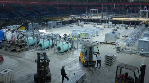 „Ostalo je još dosta toga da se uradi, možda ovako vizuelno izgleda da smo pri kraju ali ima još. Mora da se pomeri čitav ovaj pul-bek, da se rastavi konstrukcija bazena, da se zatim iznesu ti balans tankovi. Ali, to je već sve tehnika, ovo su uigrani ljudi, pogotovo šanski deo ekipe. Takođe, skidanje ove audio i svetlosne opreme je veliki posao, veliki su ti svodovi i reflektori, to da bi se uklonilo potrebno je prvo da sve očistimo, da bi te posebne mašine mogle da uđu u ovaj prostor. Najmanje deset sati je potrebno samo za to“ objasnio je Darko Udovičić, specijalni savetnik EP 2026.